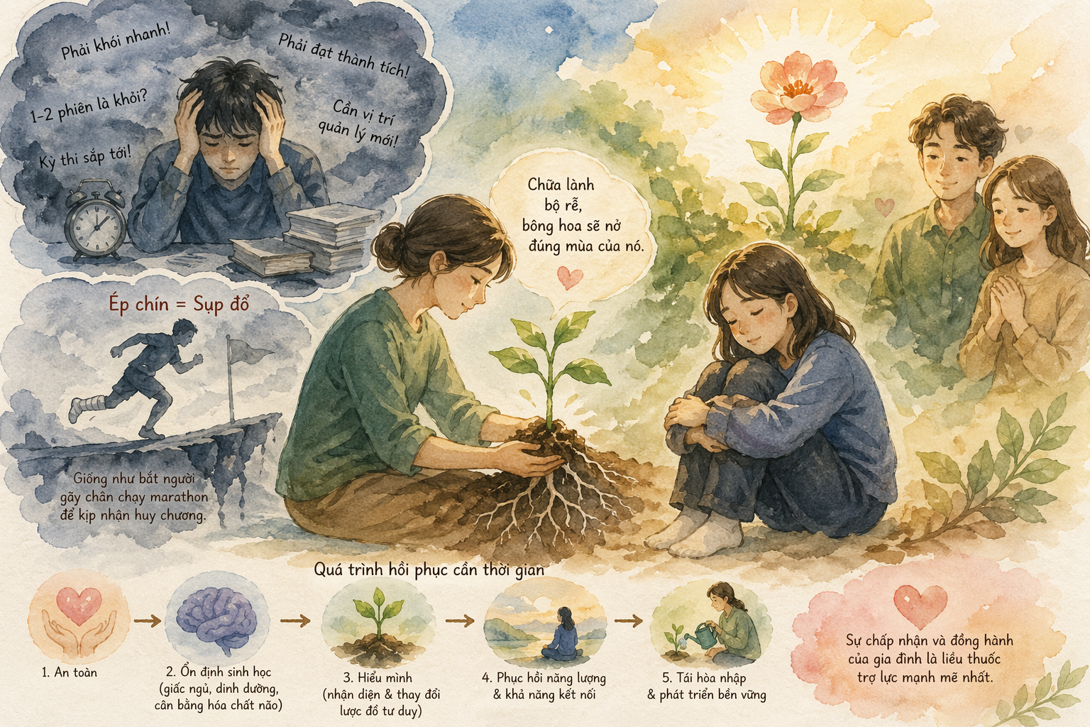 Khi người thân hoặc chính thân chủ đặt áp lực “phải khỏi nhanh”, họ vô tình tạo ra một tầng áp lực thứ hai: Sợ không kịp tiến độ. Tầng áp lực này làm gia tăng sự tự ti, khi không đạt được mục tiêu học tập/công việc đúng hạn, thân chủ càng cảm thấy mình vô dụng (triệu chứng cốt lõi của trầm cảm). Hơn nữa áp lực sợ không kịp tiến độ còn khiến nguy cơ tái phát cao, trị liệu “vội” thường chỉ giải quyết phần ngọn (triệu chứng bề mặt). Khi gốc rễ chưa ổn định mà đã phải đối mặt với áp lực lớn, sự sụp đổ lần hai sẽ trầm trọng hơn nhiều.